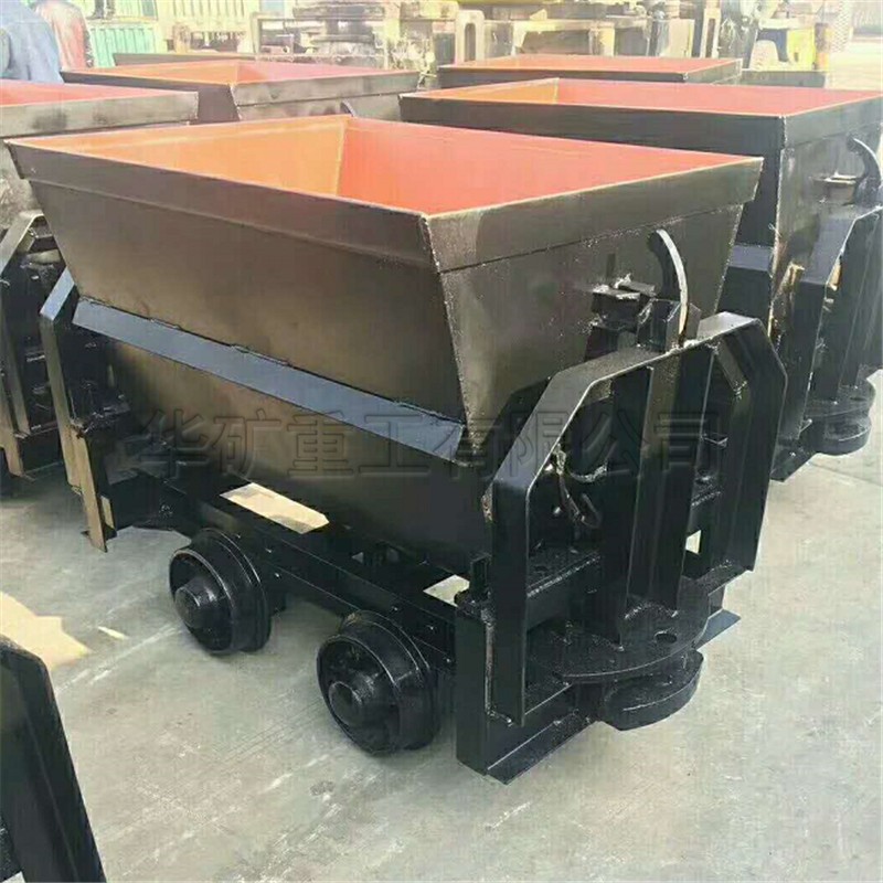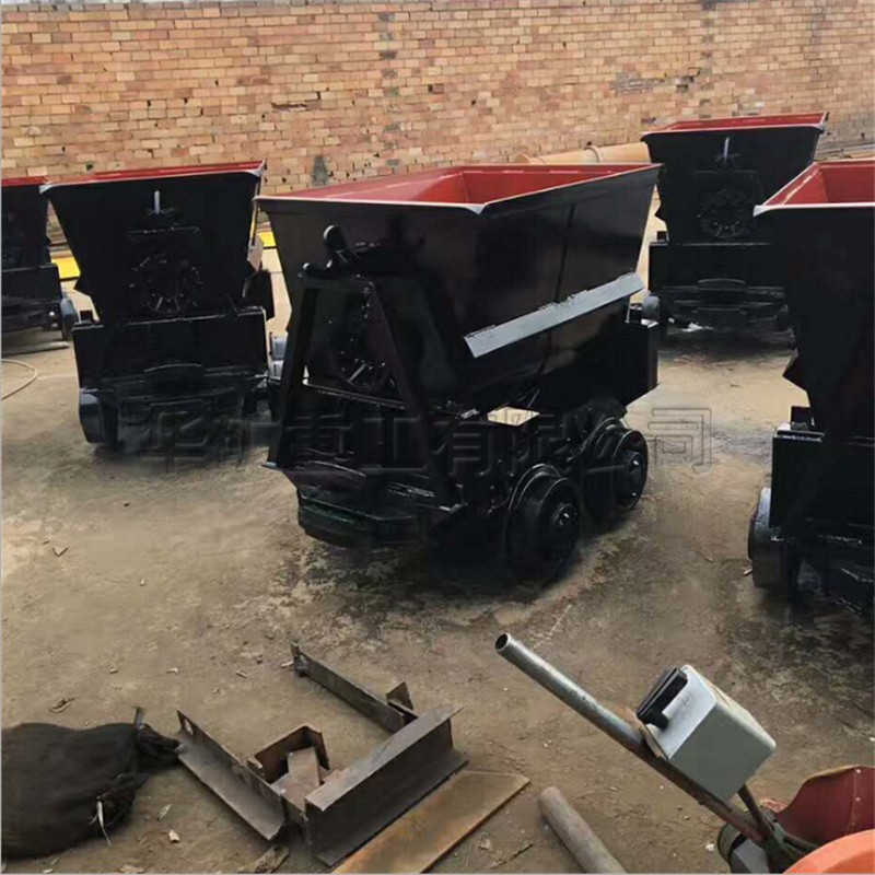 翻斗式礦車車箱斷面為V形或U形,支承在車架的翻轉軌上,車箱在翻轉軌上翻轉卸載。翻斗式礦車用在礦山或建筑工地上,用來運輸碎的塊狀物料。如:礦石、煤炭、石頭等。由車箱、車架、緩沖碰頭、輪軸等組成。結構簡單,堅固耐用、使用方便、只需人力打開止動板就能很容易地卸下物料。輪軸采用了滾柱軸承,有效地減少了運行阻力,用人力即可推動。